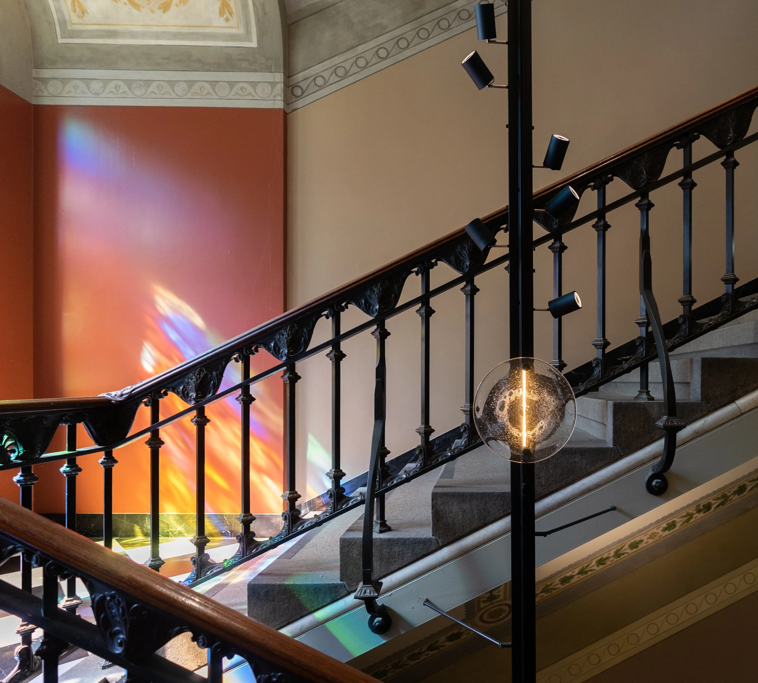 The sun is setting in the horizon at the Copanhagen panorama space at the top of Copenhagen Museum.