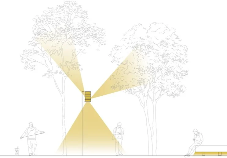 The space-creating light will fade up at the edge of astronomical twilight, creating space within the space. The light will shape trees and vertical surfaces, ensuring that we lift our gaze and look up towards the tops of towers and the sky.