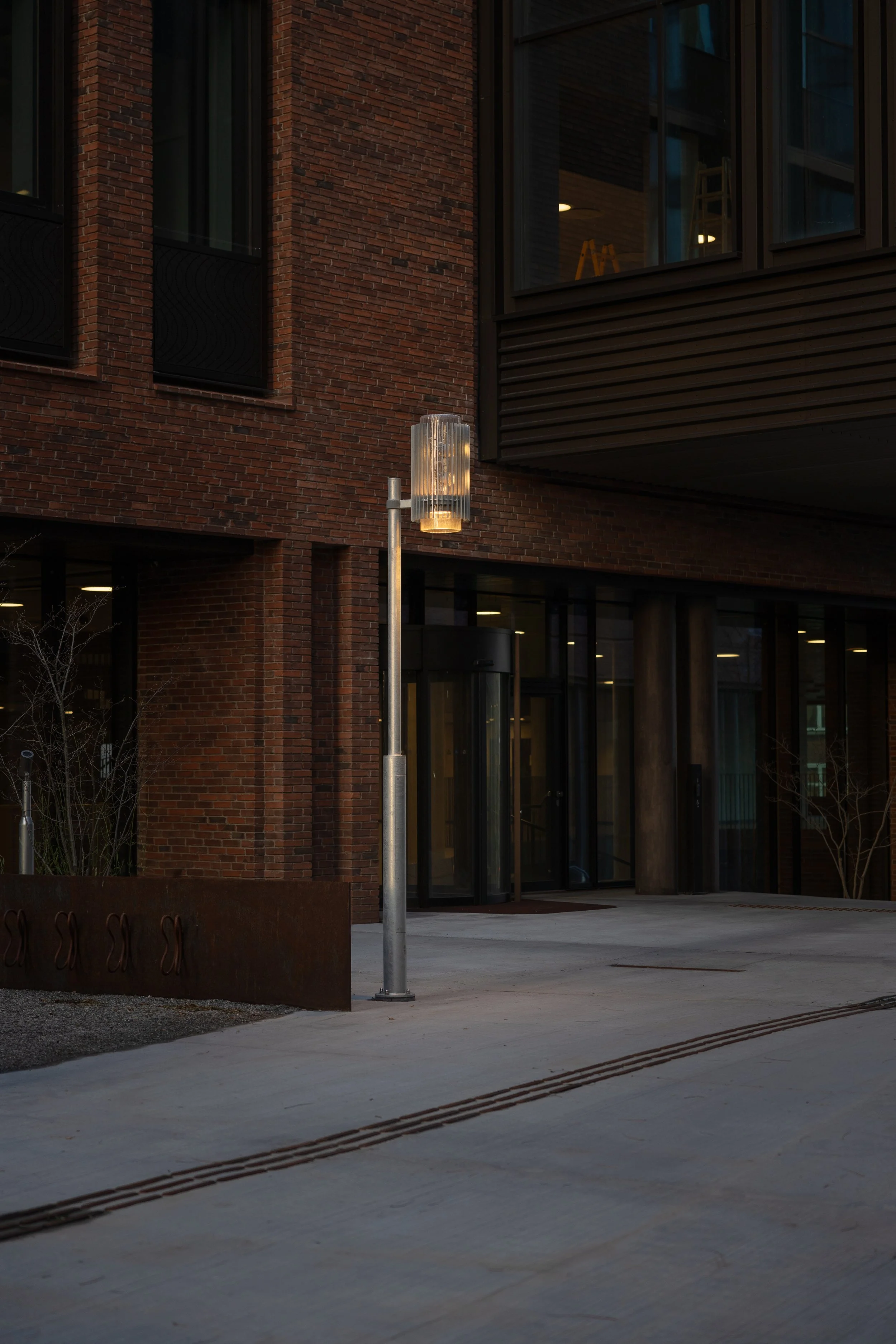 The park lamp was developed for the 30,000 square meters of landscape surrounding Danske Bank's new headquarters at Postgrunden in Copenhagen. The lamp is made of galvanized steel and hand-blown glass, referencing the neighboring districts and old Copenhagen lamps.